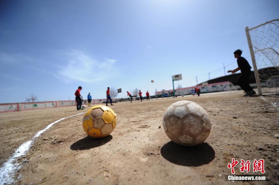 Despite the harsh conditions, the students play football happily in the rough playground with swirling dust. (CNS/Yang Yanmin)