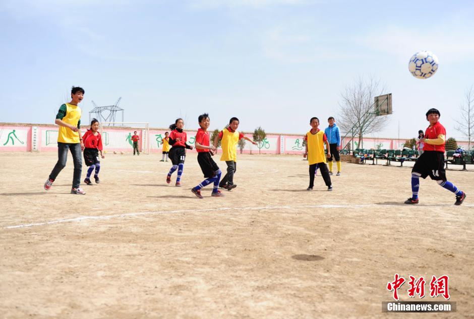Despite the harsh conditions, the students play football happily in the rough playground with swirling dust. (CNS/Yang Yanmin)