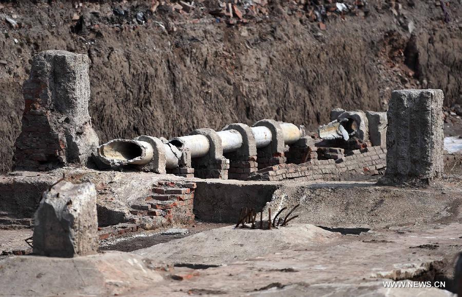Photo taken on April 9, 2015 shows a piece of pipeline cleared out at the core area of the site of the Japanese Unit 731 troop in Harbin, capital of northeast China's Heilongjiang Province. Unit 731 was a biological and chemical warfare troop set up in China by the Japanese invaders during World War II. The clearing process in the Unit 731 site's core area, which consists of a bacteria lab and a prison used to keep people for biological experiments, will be open to the public around the 70th anniversary of China's victory in World War II and the Chinese People's War of Resistance Against Japanese Aggressions this year. (Xinhua/Wang Jianwei)