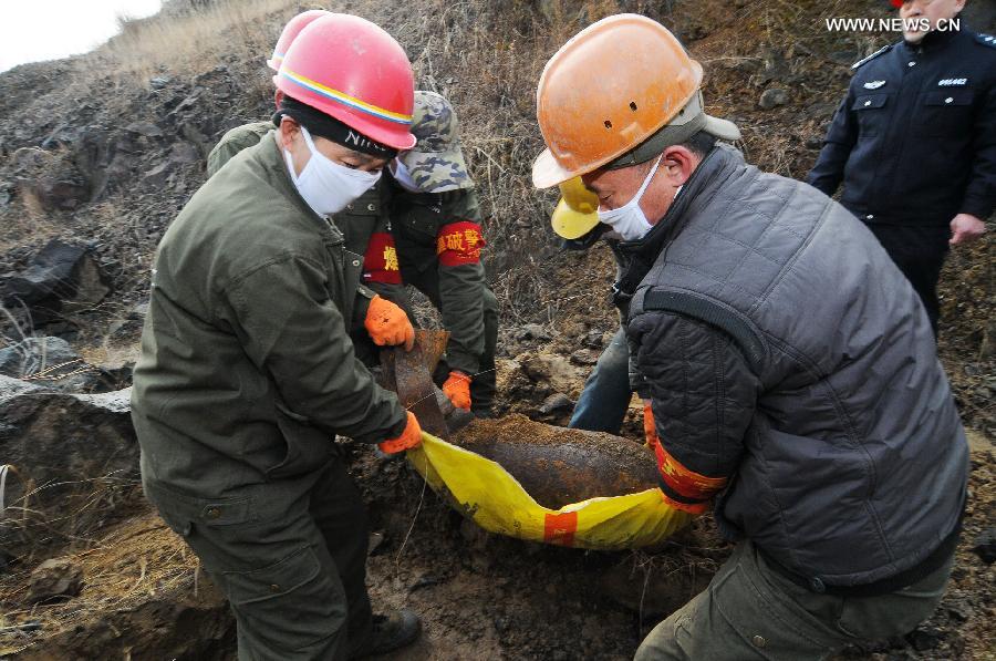 Staff members prepare to destroy Japanese weapons in Mudanjiang City, northeast China's Heilongjiang Province, April 10, 2015. A total of 475 non-chemical weapons left by Japanese invading troops were destroyed at Henan Village of Hainan Township in the Xi'an District of Mudanjiang on Friday. (Xinhua/Zhang Chunxiang)