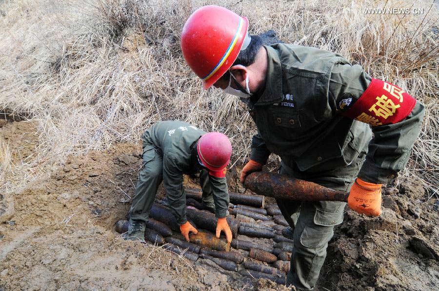 Staff members prepare to destroy Japanese weapons in Mudanjiang City, northeast China's Heilongjiang Province, April 10, 2015. A total of 475 non-chemical weapons left by Japanese invading troops were destroyed at Henan Village of Hainan Township in the Xi'an District of Mudanjiang on Friday. (Xinhua/Zhang Chunxiang)