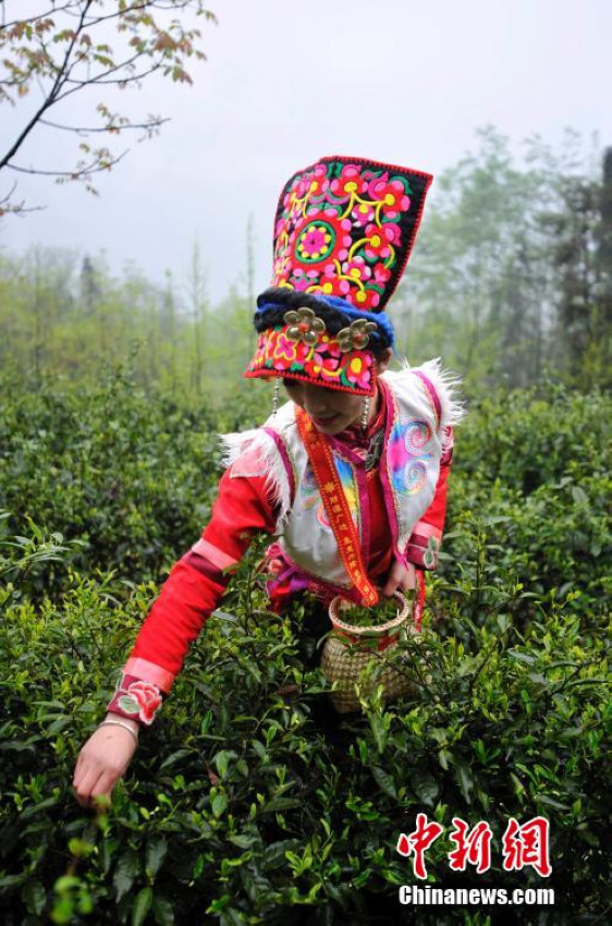A woman of Qiang ethnic group picks spring tea in Wenchuan county, southwest China’s Sichuan province, April 8, 2015. (CNS/An Yuan)