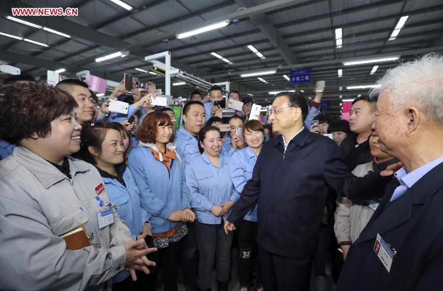 Chinese Premier Li Keqiang (C) inspects the bulb and electric wire company of Changchun, capital of northeast China's Jilin Province, April 9, 2015. Li made an inspection tour in Jilin from April 9 to 10. (Xinhua/Ding Lin)