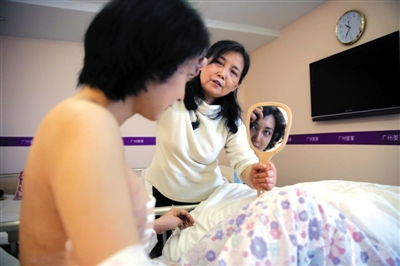 | March 5, 2015 – While Liu Ting is still recovering from breast augmentation surgery, her mother brings her a mirror. (Photo/Beijing News) |