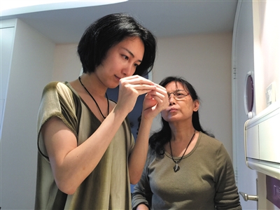 | April 6, 2015 - Liu Ting helps her mother thread a needle after her transsexual operation. (Photo/Beijing News) |