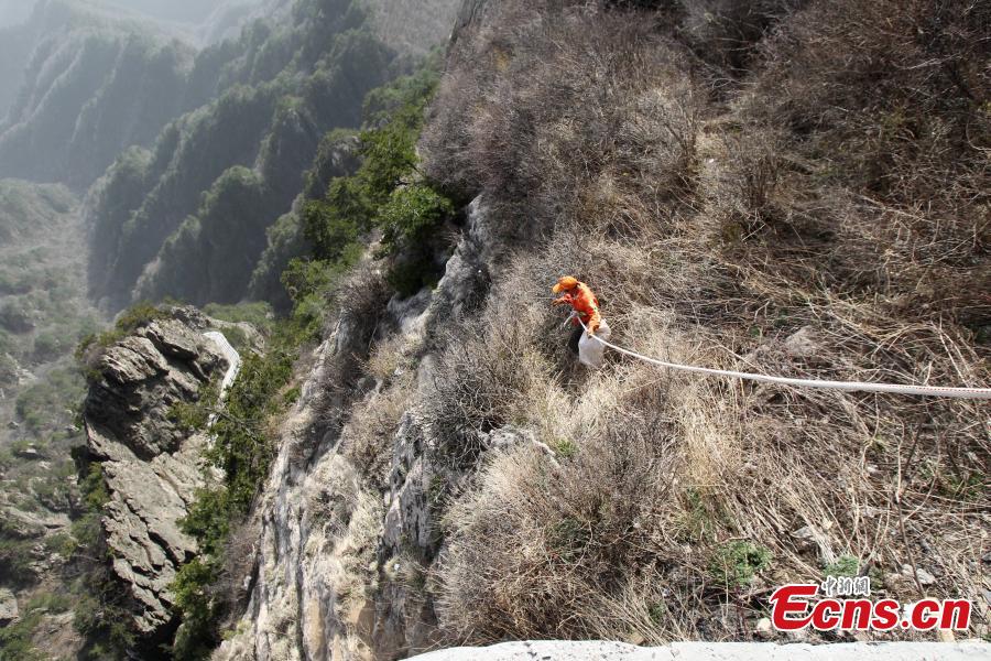 Cleaner Zhang Shuang collects litter dropped by tourists on the cliff of Laojun Mountain, 2,000 meters above sea level, in Luoyang, Central China’s Hunan province, April 16, 2015. Zhang Shuang risks his life to abseil down the cliff every three to five days for the past eight years as a cleaner. He calls for tourists to stop littering and polluting the environment. (Photo: China News Service/Wang Zhongju)