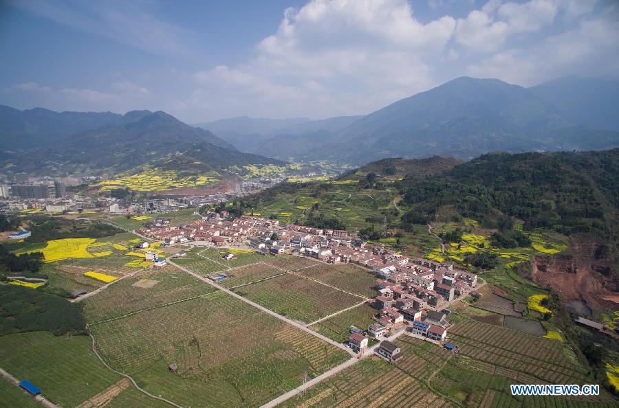 | An aerial view of Daluoping New Village of Fucheng Town in Yingjing County, southwest China's Sichuan Province, is seen in this picture taken on March 14, 2015, ahead of the two anniversary of the 7.0-magnitude earthquake hitting neighboring Lushan County on April 20, 2013. (Xinhua/li Qiaoqiao) |