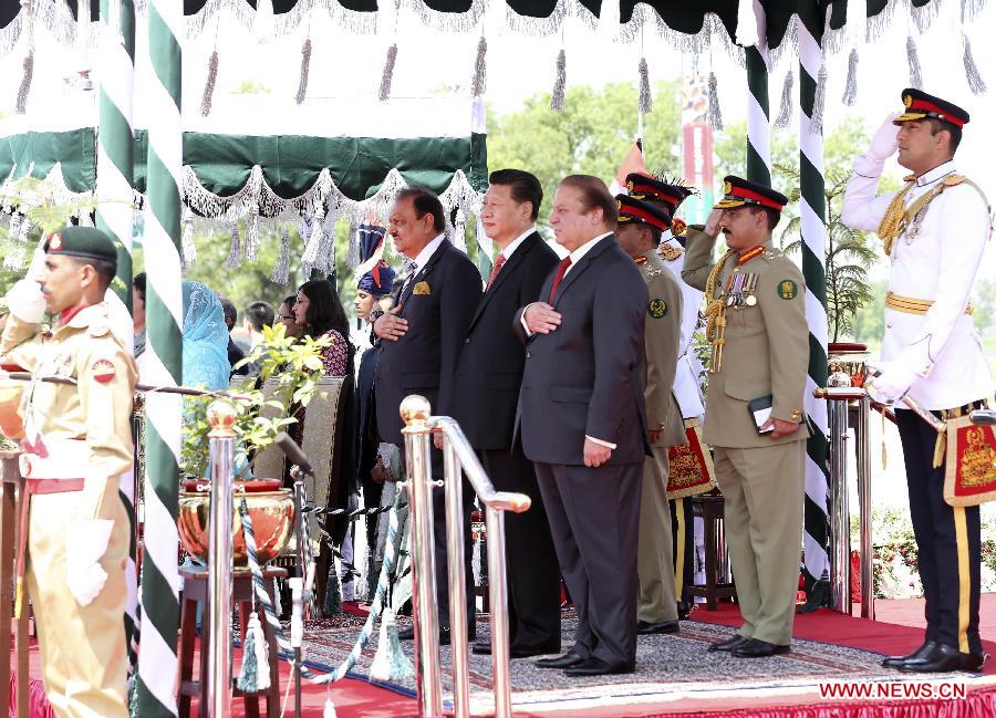 Chinese President Xi Jinping (C) attends a welcoming ceremony held by Pakistani President Mamnoon Hussain and Prime Minister Nawaz Sharif in Islamabad, capital of Pakistan, April 20, 2015. (Xinhua/Lan Hongguang)