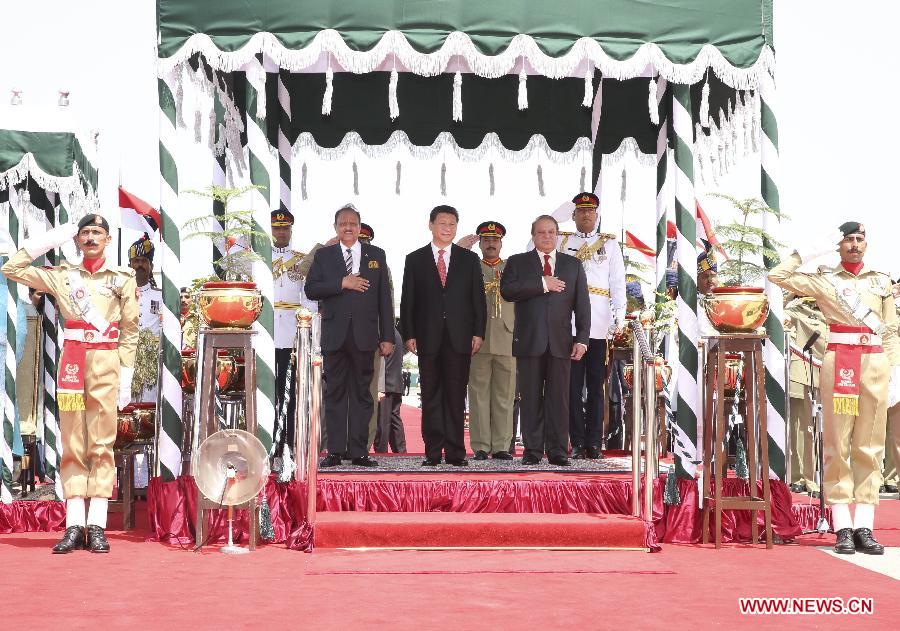 | Chinese President Xi Jinping (C) attends a welcoming ceremony held by Pakistani President Mamnoon Hussain and Prime Minister Nawaz Sharif in Islamabad, capital of Pakistan, April 20, 2015. (Xinhua/Lan Hongguang) |