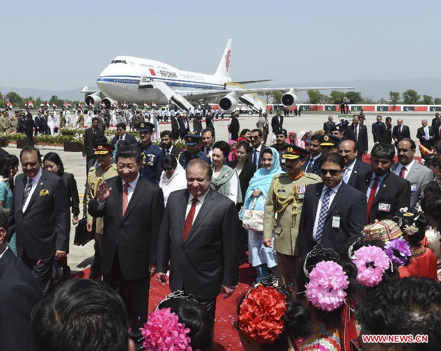 Chinese President Xi Jinping (2nd L, front) attends a welcoming ceremony held by Pakistani President Mamnoon Hussain and Prime Minister Nawaz Sharif in Islamabad, capital of Pakistan, April 20, 2015. (Xinhua/Li Xueren)
