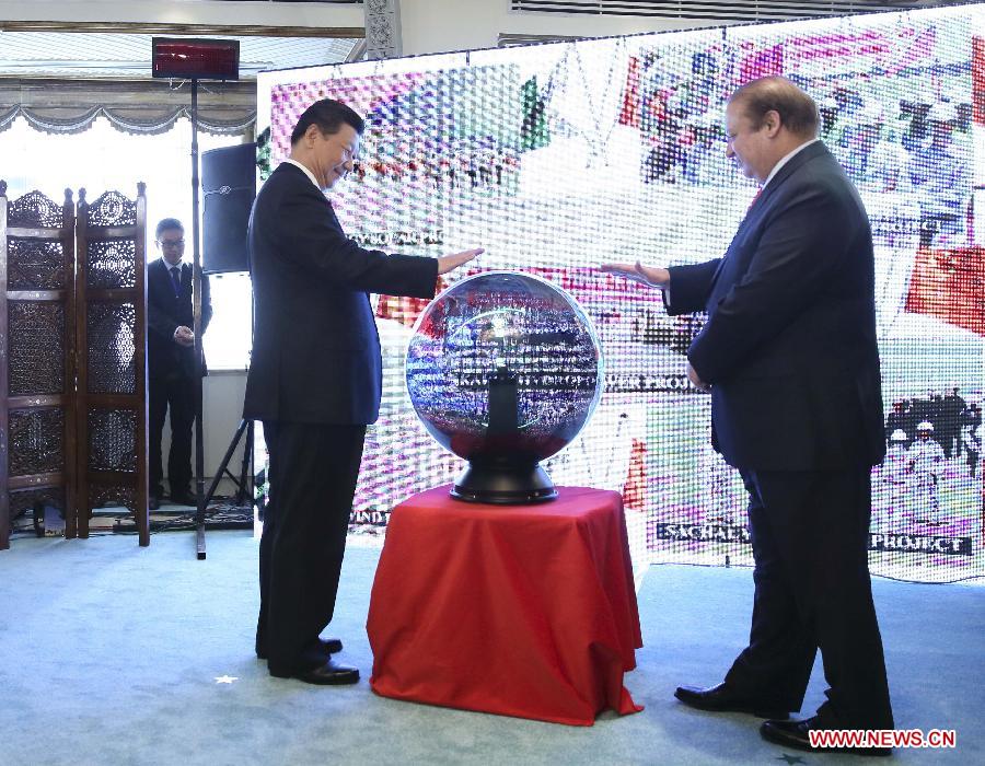 Visiting Chinese President Xi Jinping (L) and Pakistani Prime Minister Nawaz Sharif attend a launching ceremony for cooperative deals between the two sides after their talks in Islamabad, capital of Pakistan, April 20, 2015. (Xinhua/Lan Hongguang)