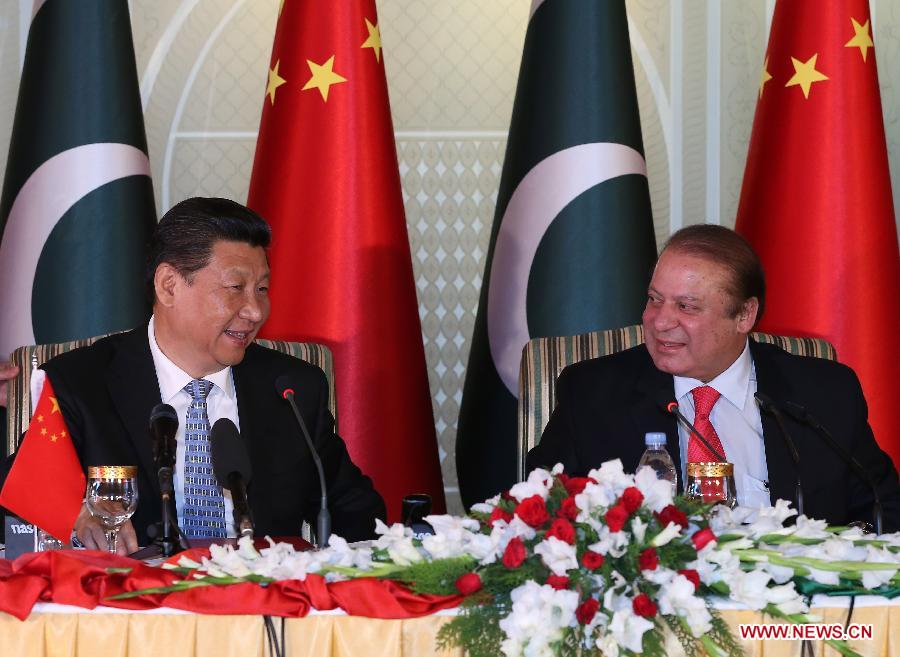 Visiting Chinese President Xi Jinping (L) and Pakistani Prime Minister Nawaz Sharif attend a press conference after their talks in Islamabad, capital of Pakistan, April 20, 2015. (Xinhua/Lan Hongguang)
