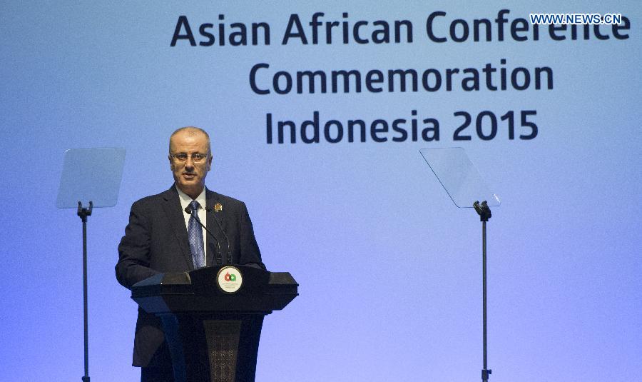 Palestinian Prime Minister Rami Hamdallah speaks during the Asian-African Summit in Jakarta, capital of Indonesia, on April 22, 2015. The summit is held here Wednesday. (Xinhua/Lui Siu Wai)