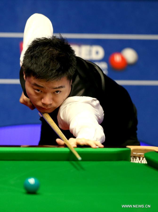 Ding Junhui of China competes during the second half of the first round match against Mark Davis of England at the 2015 World Snooker Championship in the Crucible Theatre, Sheffield, England on April 21, 2015. Ding won 10-7. (Xinhua/Han Yan)