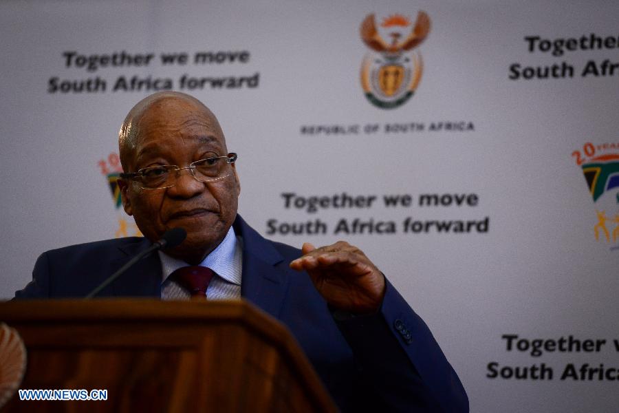 South African President Jacob Zuma addresses a media briefing after meeting with leaders of organizations representing foreigners in Pretoria, South Africa, on April 24, 2015. South African President Jacob Zuma on Friday met with leaders of organizations representing foreigners, assuring them of maximum protection. (Xinhua/Zhai Jianlan)