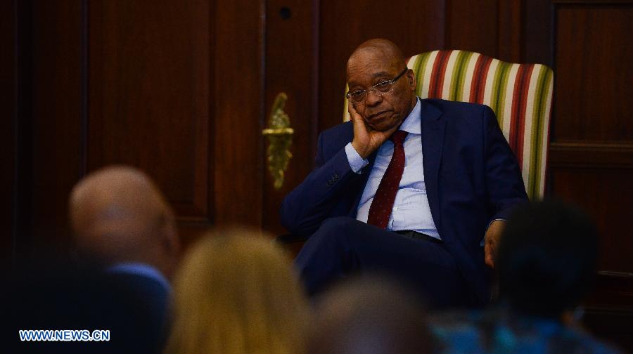 South African President Jacob Zuma listens to a question raised by a journalist during a media briefing after his meeting with leaders of organizations representing foreigners in Pretoria, South Africa, on April 24, 2015. South African President Jacob Zuma on Friday met with leaders of organizations representing foreigners, assuring them of maximum protection. (Xinhua/Zhai Jianlan)