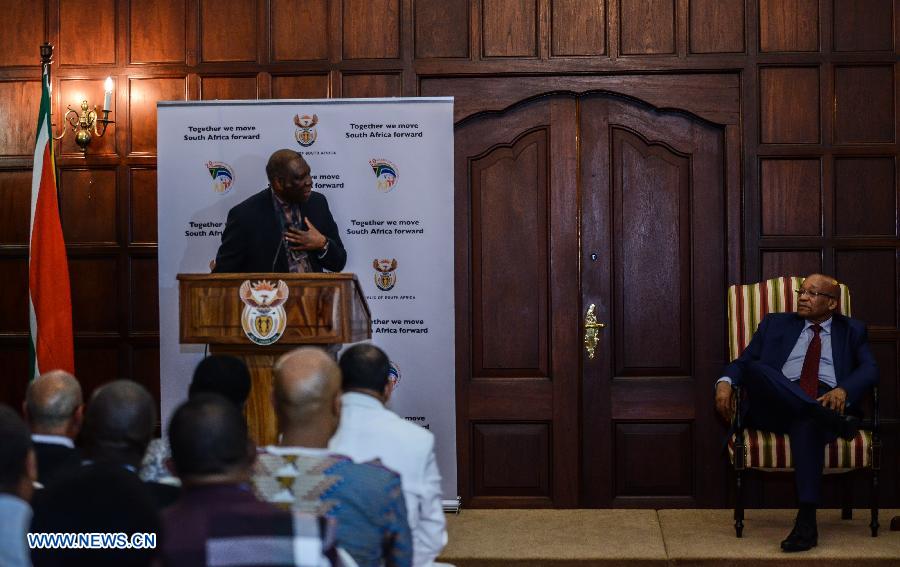 | South African President Jacob Zuma (R) listens to the remarks by a representative of Malawi Frank Mlotchwa during a media briefing after his meeting with leaders of organizations representing foreigners in Pretoria, South Africa, on April 24, 2015. South African President Jacob Zuma on Friday met with leaders of organizations representing foreigners, assuring them of maximum protection. (Xinhua/Zhai Jianlan) |