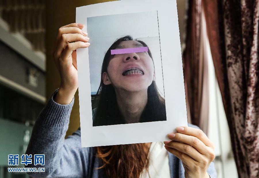 In this photo taken on April 1, Zhou Jun shows her photo after a failed plastic surgery in South Korea. (Xinhua Photo)