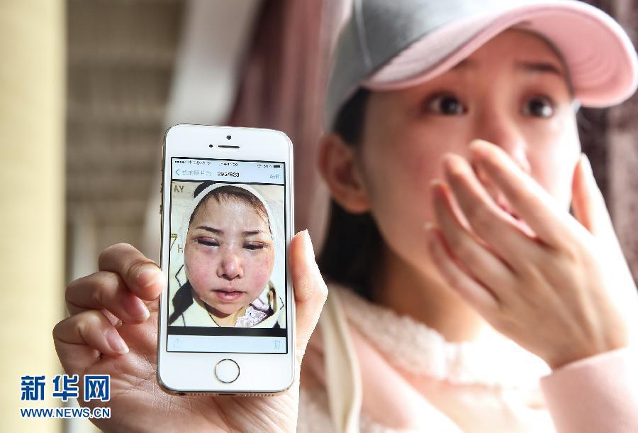 In this photo taken on April 1, Mi Yuanyan shows her photo after a failed cosmetic surgery. (Xnhua Photo)