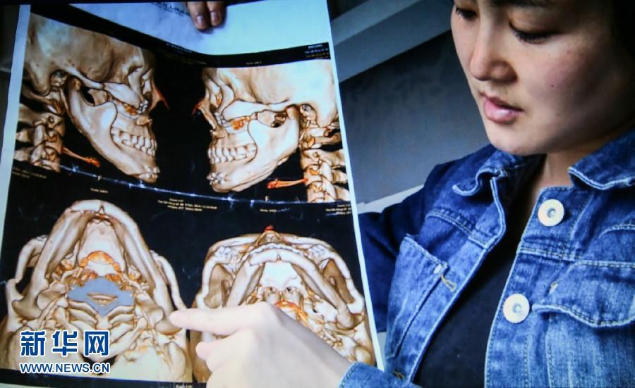 In this photo taken on April 1, Jin Weikun shows the CT image after a failed plastic surgery in South Korea. (Xinhua Photo)