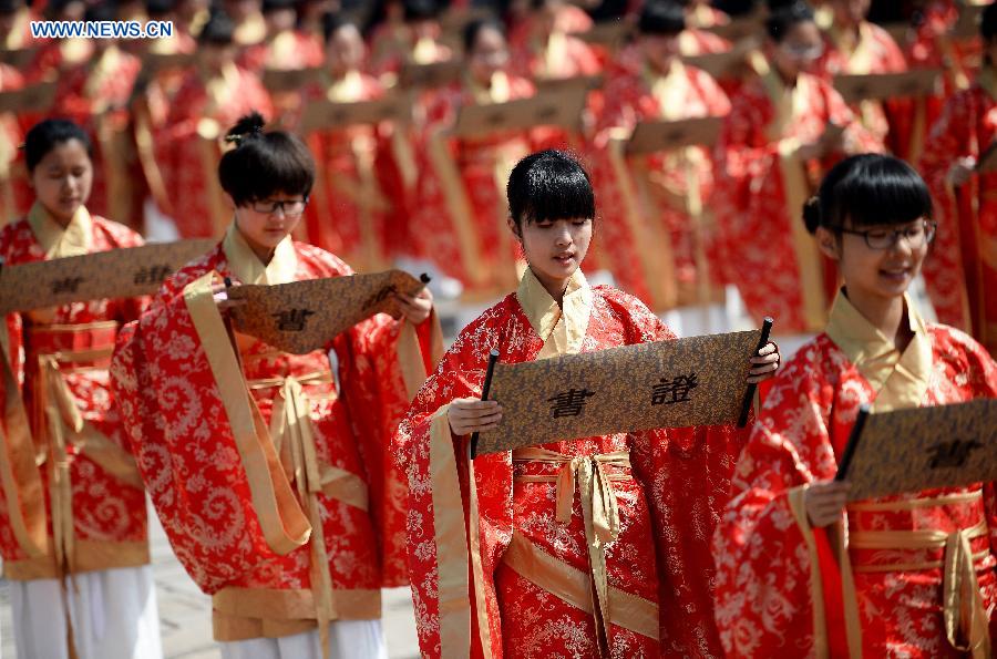 Students take an oath during an adult ceremony in Xi'an, capital of northwest China's Shaanxi Province, May 2, 2015. Over 1,000 students attiring Han costumes bowed to teachers and parents to declare being grown-ups. (Xinhua/Liu Xiao)