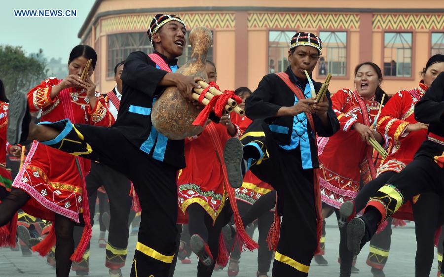 People of Va ethnic group perform the scene of hunting during a parade of cultural carnival in Cangyuan Va Autonomous County, southwest China's Yunnan Province, May 2, 2015. (Xinhua/Chen Haining)