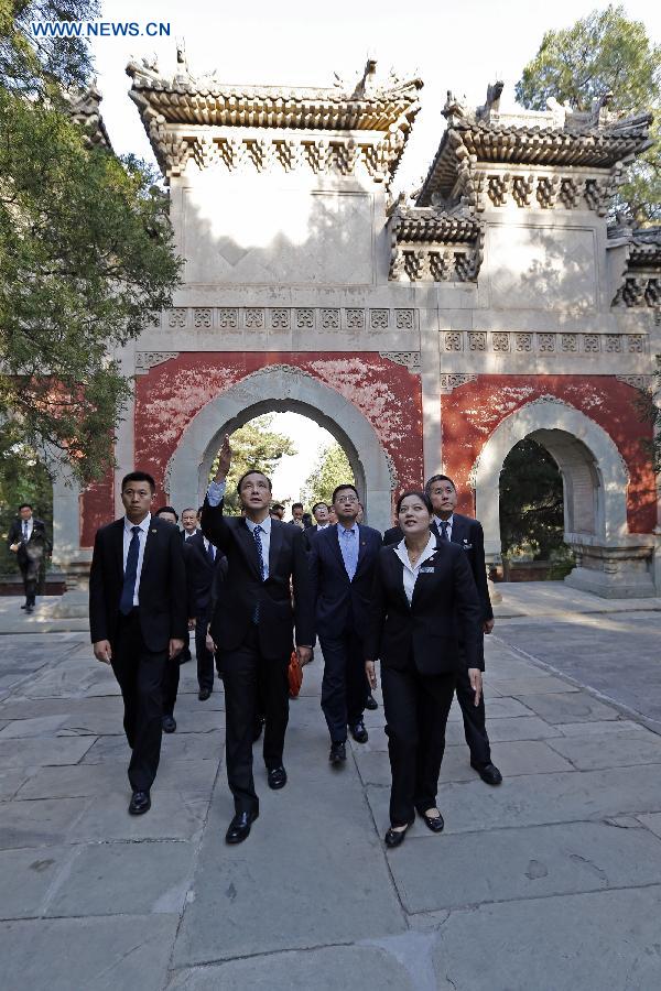 Chinese Kuomintang (KMT) Chairman Eric Chu (2nd L, front) visits the Biyun Temple in Xiangshan, or Fragrant Hills, in Beijing, capital of China, May 4, 2015. (Xinhua/Shen Bohan)