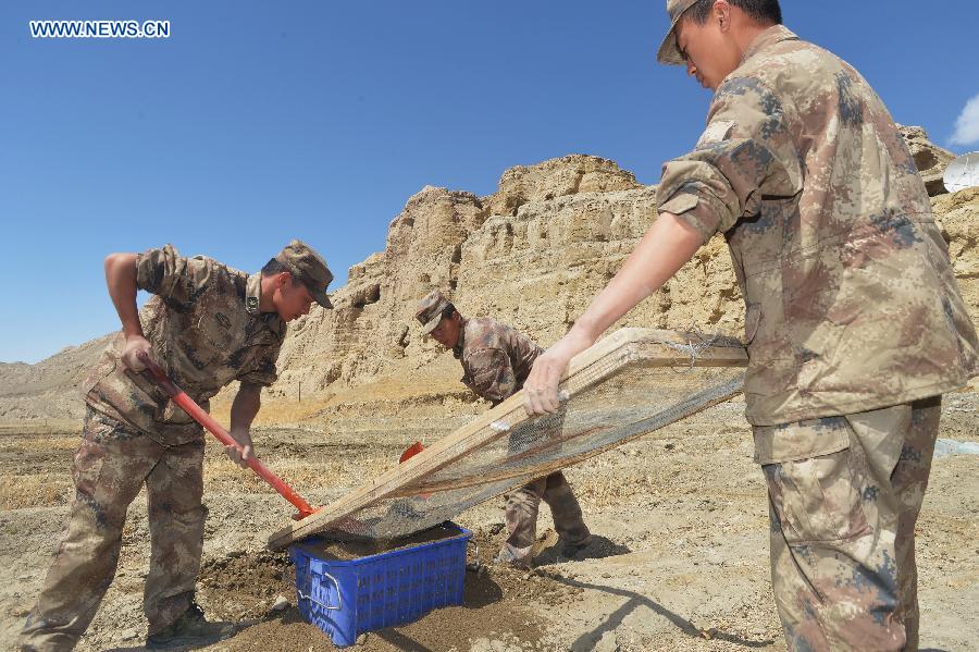 Soldiers of local garrison prepare planting soil for growing greenhouse vegetables in Zanda County of Ngari Prefecture, southwest China's Tibet Autonomous Region, May 5, 2015. Local people in Zanda have learnt to grow greenhouse vegetables and raise livestocks in recent years to meet the basic demand of a healthy lifestyle in the altitude-hardy Qinghai-Tibet Plateau. (Xinhua/Xiang Wenjun)