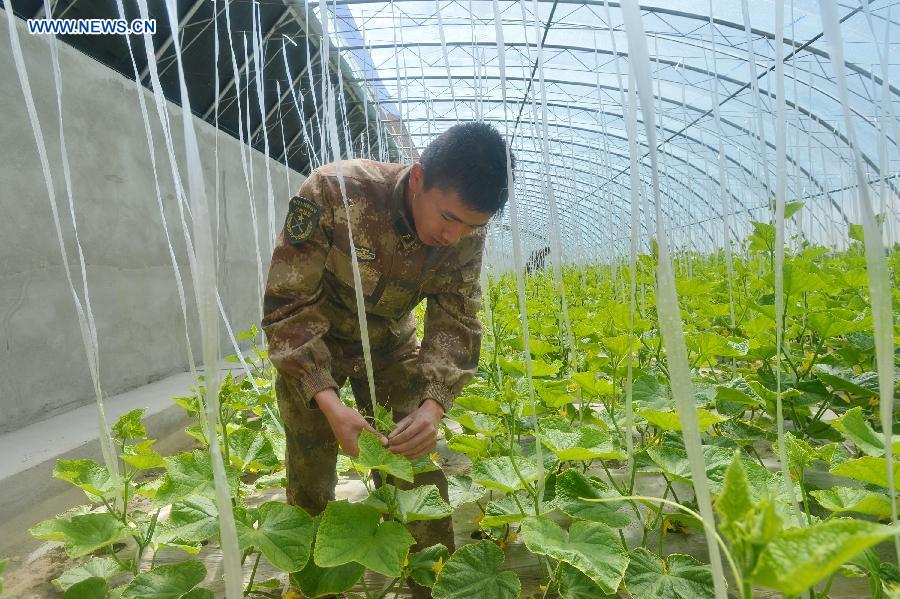 A soldier of local garrison works in a plastic greenhouse in Zanda County of Ngari Prefecture, southwest China's Tibet Autonomous Region, May 5, 2015. Local people in Zanda have learnt to grow greenhouse vegetables and raise livestocks in recent years to meet the basic demand of a healthy lifestyle in the altitude-hardy Qinghai-Tibet Plateau. (Xinhua/Xiang Wenjun)