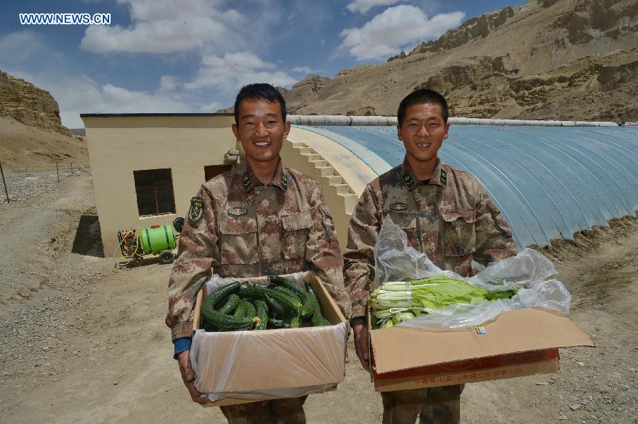 Soldiers of local garrison carry boxes of vegetables they just harvested in a plastic greenhouse in Zanda County of Ngari Prefecture, southwest China's Tibet Autonomous Region, May 5, 2015. Local people in Zanda have learnt to grow greenhouse vegetables and raise livestocks in recent years to meet the basic demand of a healthy lifestyle in the altitude-hardy Qinghai-Tibet Plateau. (Xinhua/Xiang Wenjun)