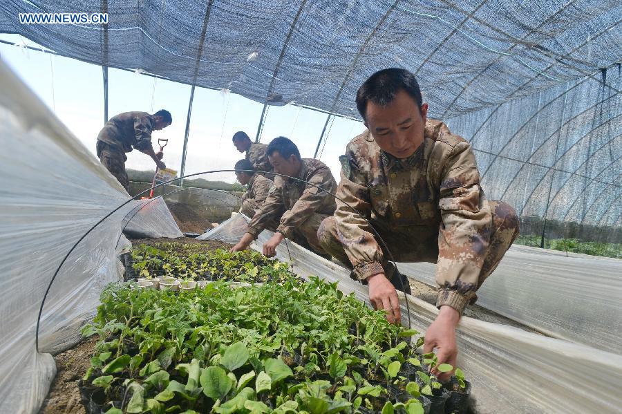 Soldiers of local garrison work in a plastic greenhouse in Zanda County of Ngari Prefecture, southwest China's Tibet Autonomous Region, May 5, 2015. Local people in Zanda have learnt to grow greenhouse vegetables and raise livestocks in recent years to meet the basic demand of a healthy lifestyle in the altitude-hardy Qinghai-Tibet Plateau. (Xinhua/Xiang Wenjun)