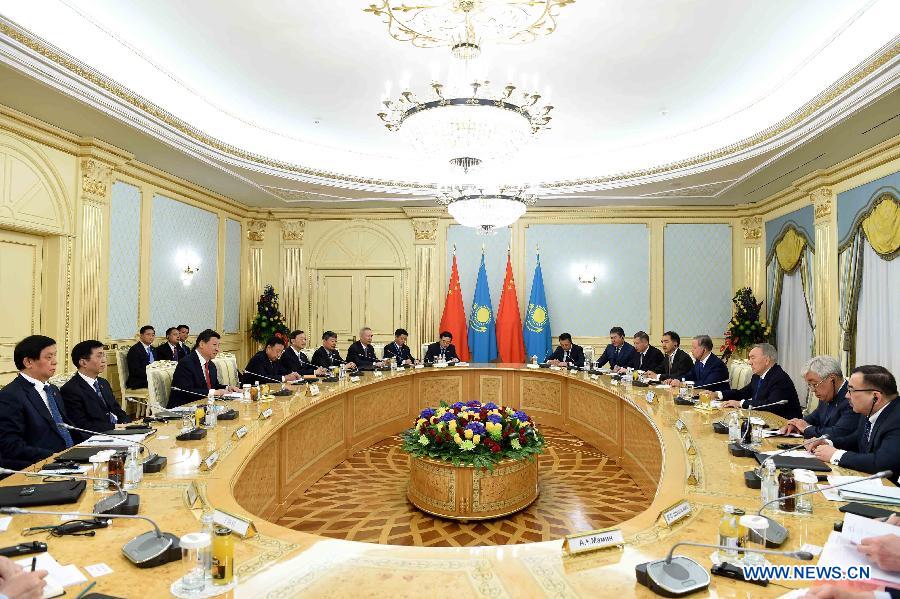 Chinese President Xi Jinping (3rd L) holds talks with Kazakh President Nursultan Nazarbayev (3rd R) in Astana, Kazakhstan, May 7, 2015. (Xinhua/Rao Aimin)