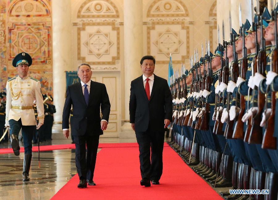 Chinese President Xi Jinping (3rd L, front) attends a welcoming ceremony held by Kazakh President Nursultan Nazarbayev (2nd L) in Astana, Kazakhstan, May 7, 2015. (Xinhua/Liu Weibing)