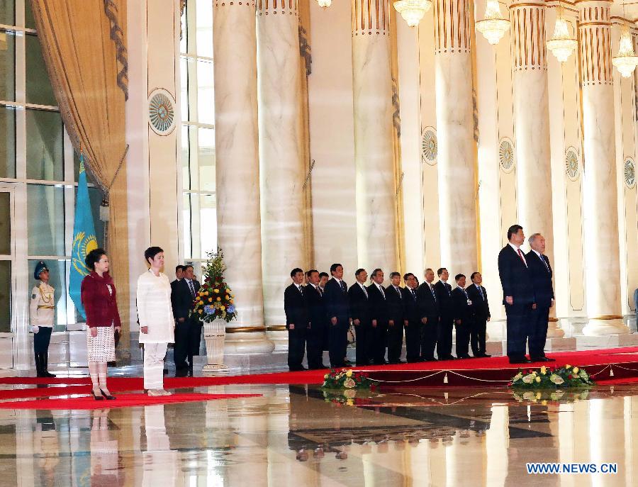 Chinese President Xi Jinping (2nd R) attends a welcoming ceremony held by Kazakh President Nursultan Nazarbayev (R) in Astana, Kazakhstan, May 7, 2015. (Xinhua/Liu Weibing)