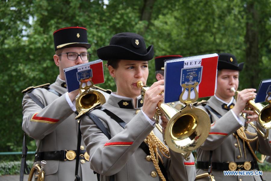 Brass band plays during the commemorative event marking the 70th anniversary of victory in the World Anti-Fascist War at the headquarters of the Council of Europe in Strasbourg, France, May 9, 2015. (Xinhua/Lu Suyan)