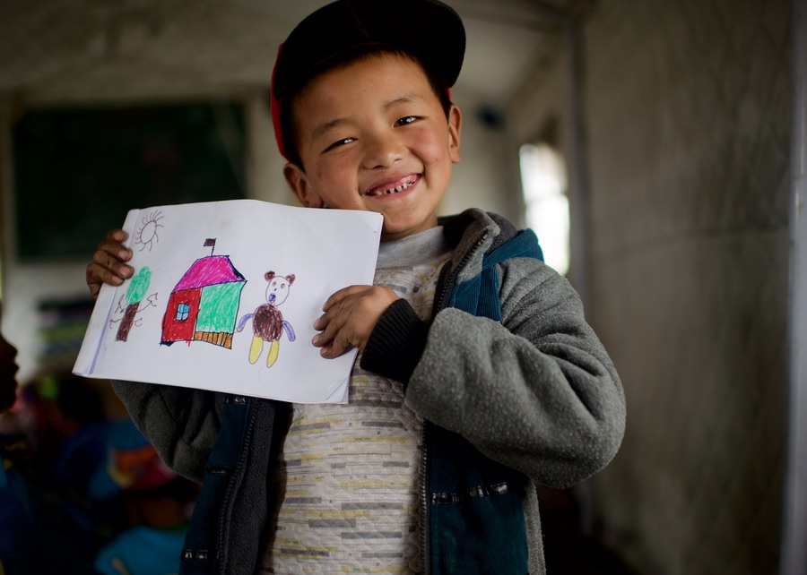 About 40 kids who have been transferred with their parents from Zhangmu Town attend a temporary kindergarten that has recently resumed operation in the more than 4000-meter high settlement in Lhatse County. The teachers teach them singing, dancing, reading and writing and help them get used to the life there.