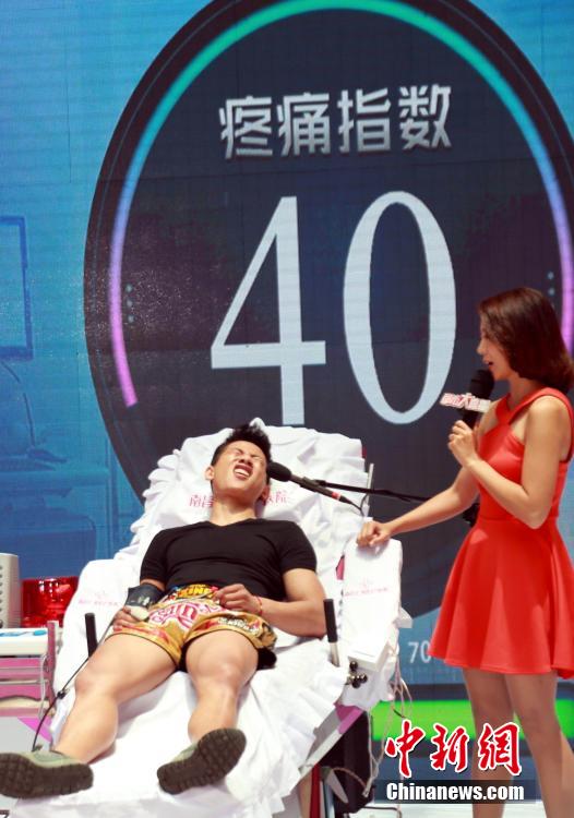 To celebrate the Mother’s Day, a special TV show “Labor Pain Challenge” was held in Nanchang, central China’s Jiangxi province on May 10, 2015. Nearly 20 “fathers-to-be” of different professions participated in the show. At last, a firefighter succeeded in challenging the pain index of 80 and won the game. The purpose of the show is to remind people of the greatness of mothers. (Chinanews/Jiang Tao)