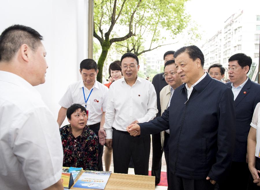 Liu Yunshan (2nd R), a member of the Standing Committee of the Political Bureau of the Communist Party of China (CPC) Central Committee and secretary of the Secretariat of the CPC Central Committee, visits a community in Zixing City, central China's Hunan Province, May 9, 2015. Liu had an inspection tour in Hunan from May 8 to 11.(Xinhua/Wang Ye)