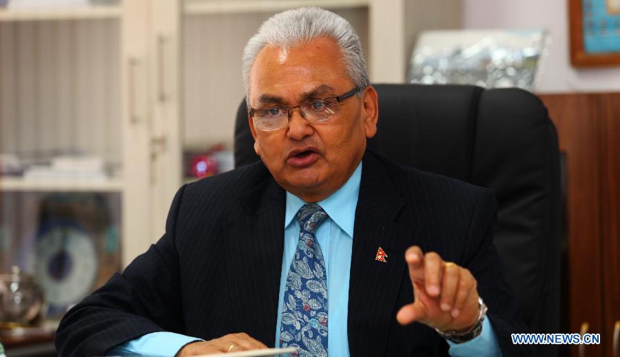 Nepal's Minister for Foreign Affairs Mahendra Bahadur Pandey speaks during an interview by Xinhua News Agency in Kathmandu, Nepal, May 11, 2015. Pandey expressed a heartfelt gratitude towards the support and cooperation provided by the Chinese government during the massive earthquake. (Xinhua/Sunil Sharma)