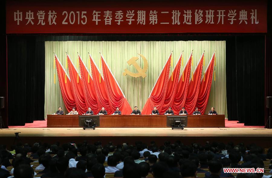 | Liu Yunshan (back C), president of the Party School of the Communist Party of China (CPC) Central Committee and a member of the Standing Committee of the Political Bureau of the CPC Central Committee, addresses the opening ceremony of the school's 2015 spring semester second batch program in Beijing, capital of China, May 13, 2015. (Xinhua/Pang Xinglei) |