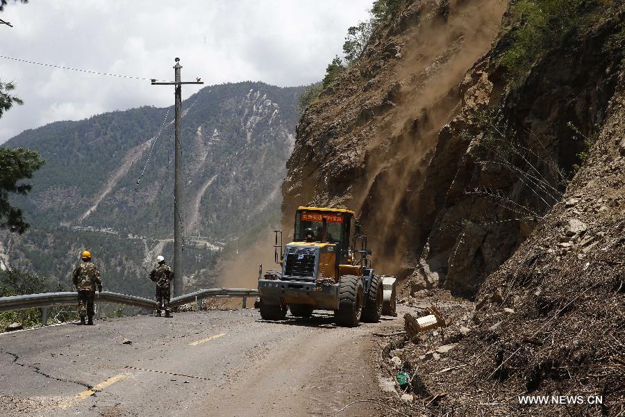 Photo taken on May 12, 2015 shows a landslide before a 7.5-magnitude quake striking China's neighbor Nepal near the border of China and Nepal in Gyirong, southwest China's Tibet Autonomous Region. One woman was killed and two other people were injured in Tibet after China's neighbor Nepal was jolted by another earthquake on Tuesday afternoon. (Xinhua/Yin Gang)