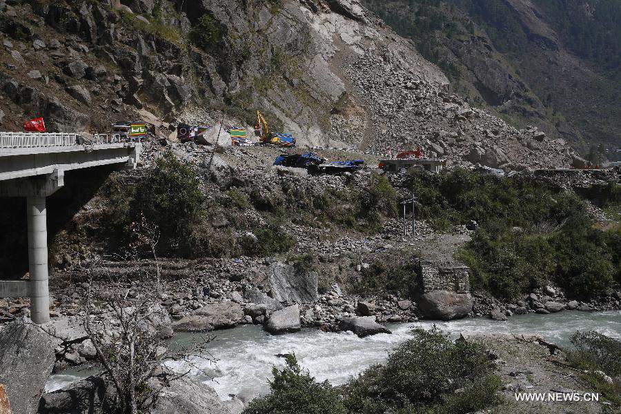 Photo taken on May 12, 2015 shows the Nepalese side of the China-Nepal border area after a 7.5-magnitude quake, in Gyirong Township, southwest China's Tibet Autonomous Region. One woman was killed and two other people were injured in Tibet after China's neighbor Nepal was jolted by another earthquake on Tuesday afternoon. (Xinhua/Yin Gang)