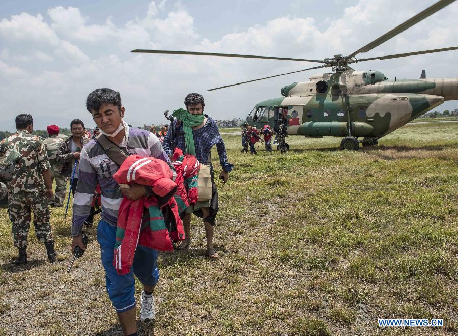 Workers of International Red Cross leave a helicopter from an army aviation brigade of the Chengdu Military Region of the People's Liberation Army of China in Kathmandu, capital of Nepal, on May 13, 2015. Three Chinese military helicopters of the brigade on Wednesday evacuated 108 people from several areas in Nepal, a day after a fresh 7.5-magnitude earthquake that claimed at least 65 lives and injured over 1,900 people, officials said. (Xinhua/Lui Siu Wai)