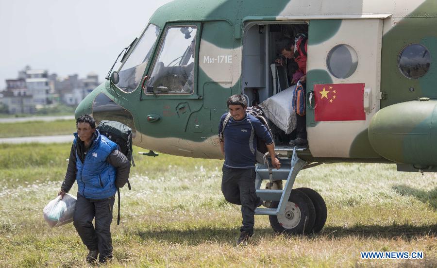| Rescuees step off a helicopter from an army aviation brigade of the Chengdu Military Region of the People's Liberation Army of China in Kathmandu, capital of Nepal, on May 13, 2015. Three Chinese military helicopters of the brigade on Wednesday evacuated 108 people from several areas in Nepal, a day after a fresh 7.5-magnitude earthquake that claimed at least 65 lives and injured over 1,900 people, officials said. (Xinhua/Lui Siu Wai) |