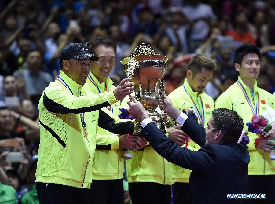 China's head coach Li Yongbo(L) accepts the Sudirman Cup during the awarding ceremony for 2015 Sudirman Cup BWF World Mixed Team Championships in Dongguan, south China's Guangdong Province, May 17, 2015. (Xinhua/Liu Dawei)
