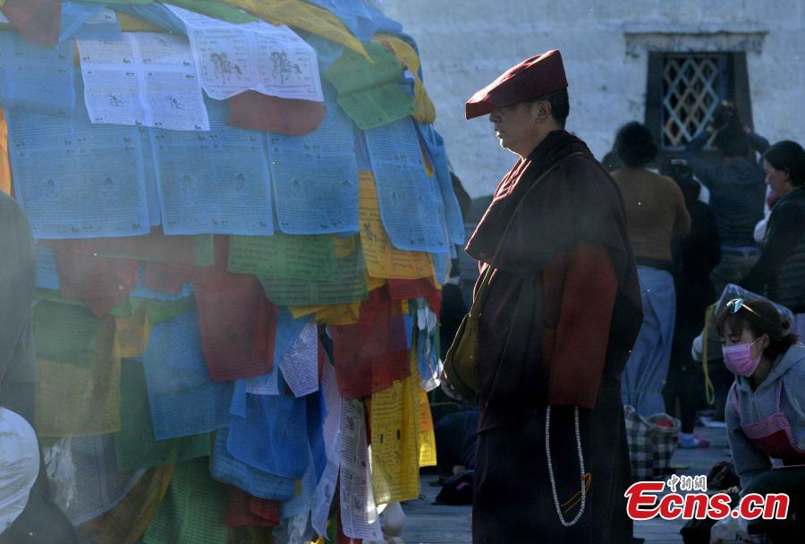 A Tibetan man stands near prayer flags in Lhasa, capital of Southwest China's Tibet autonomous region, May 19, 2015. April 1 in Tibetan calendar, which falls on May 19, is the first day of Saga Dawa festival, which will last for one month. The festival marks the birth, enlightenment and death of Sakyamuni. (Photo: China News Service/Li Lin)