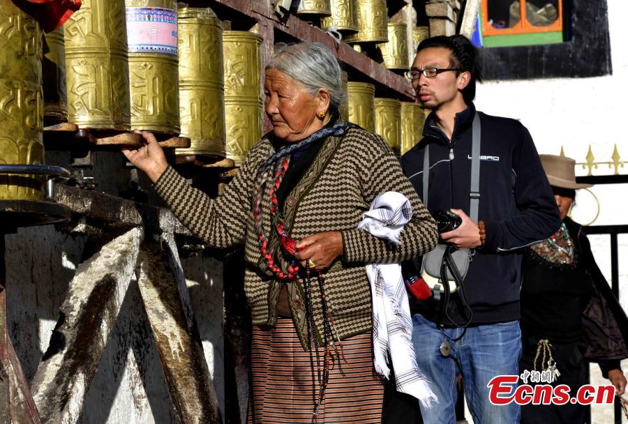 A Tibetan woman turns prayer wheels around the Jokhang Temple in Lhasa, capital of Southwest China's Tibet autonomous region, May 19, 2015. April 1 in Tibetan calendar, which falls on May 19, is the first day of Saga Dawa festival, which will last for one month. The festival marks the birth, enlightenment and death of Sakyamuni. (Photo: China News Service/Li Lin)