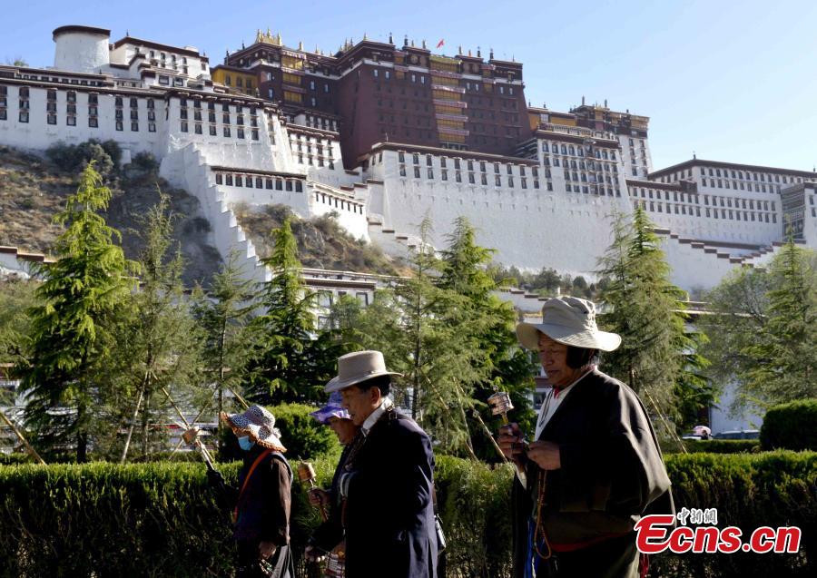 | A Tibetan woman turns prayer wheels around the Jokhang Temple in Lhasa, capital of Southwest China's Tibet autonomous region, May 19, 2015. April 1 in Tibetan calendar, which falls on May 19, is the first day of Saga Dawa festival, which will last for one month. The festival marks the birth, enlightenment and death of Sakyamuni. (Photo: China News Service/Li Lin) |