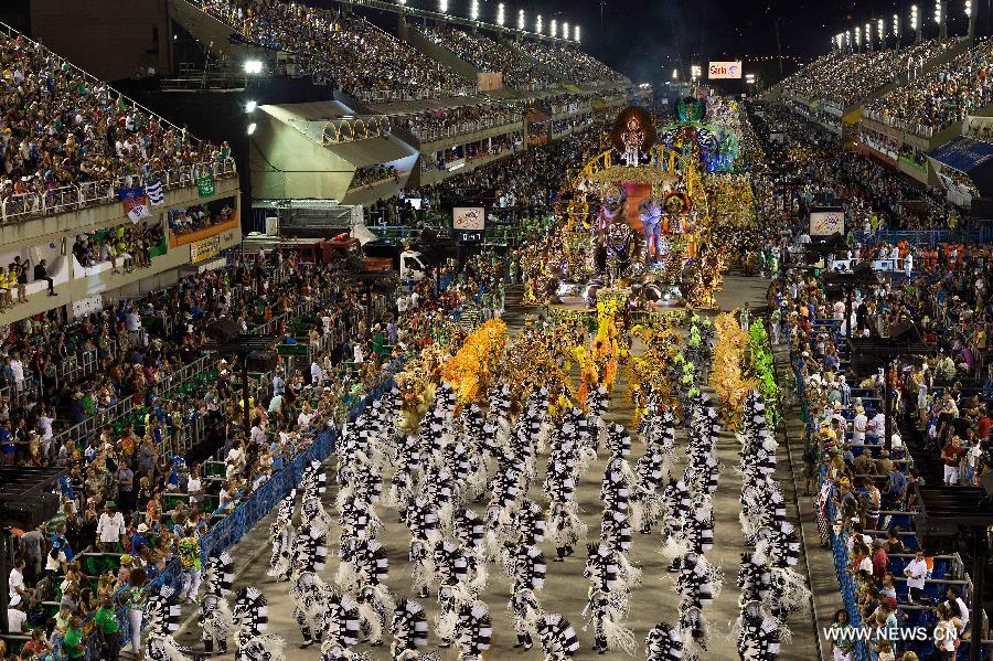 Image taken on Feb. 17, 2015 shows members of a samba school at the second night of presentations of the Carnival associations in Rio de Janeiro, Brazil. The Carnival is Brazil's most famous holiday. Chinese Premier Li Keqiang will visit Brazil, Colombia, Peru and Chile on May 18-26. (Xinhua/Peter Bauza/ZUMAPRESS)