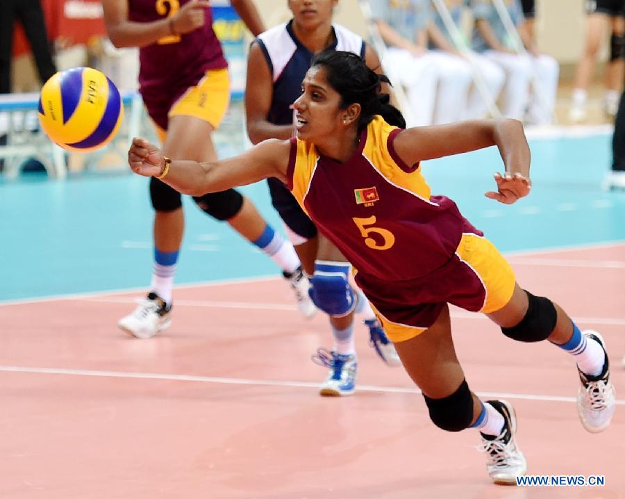 | Wasana of Sri Lanka competes during a Group B match against Hong Kong China at the 2015 Asian Women's Volleyball Championship in Tianjin, north China, May 20, 2015. Hong Kong China won 3-0. (Xinhua/Zhang Chenlin) |